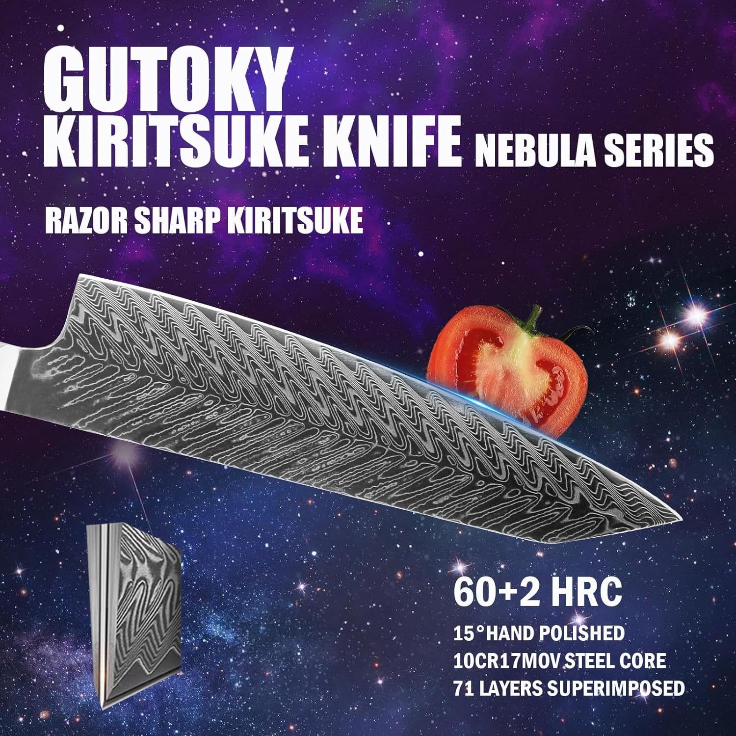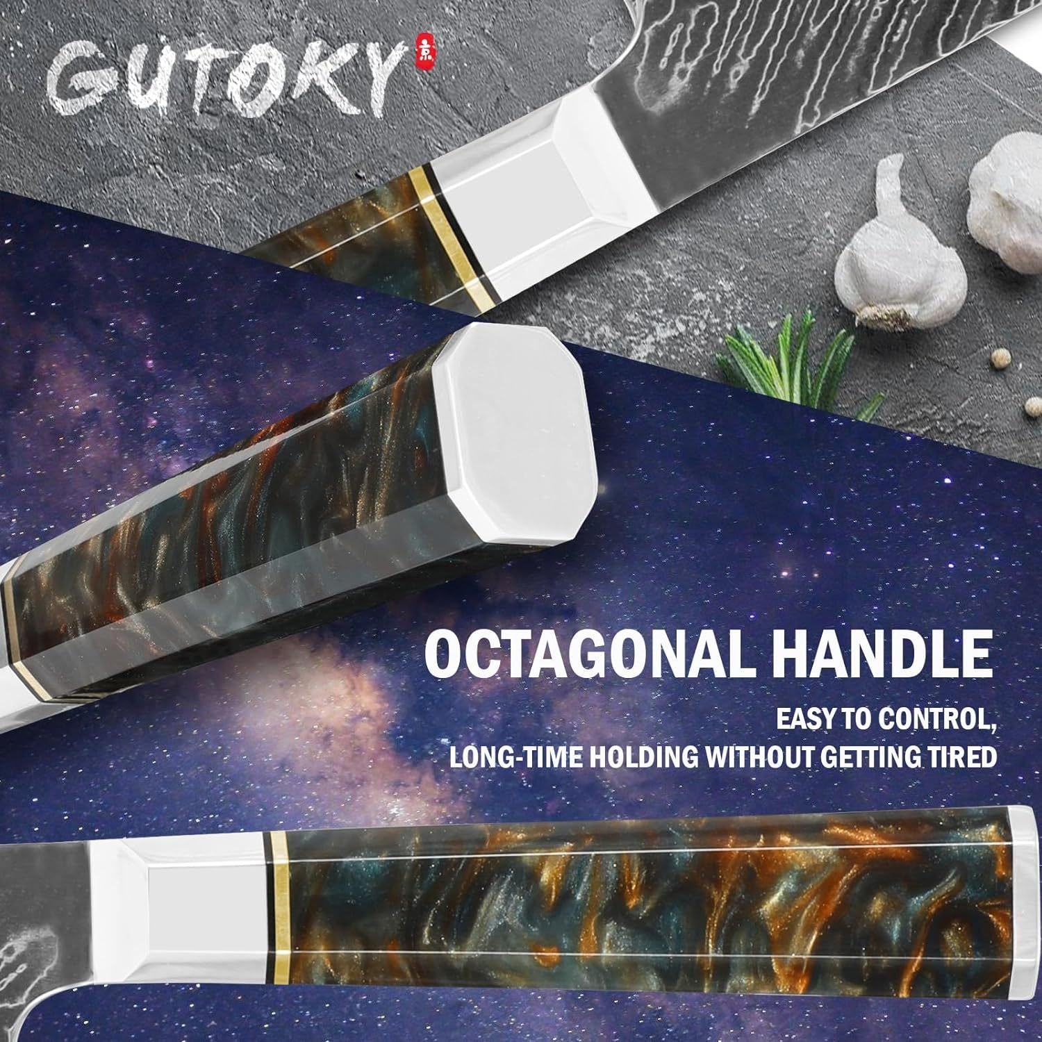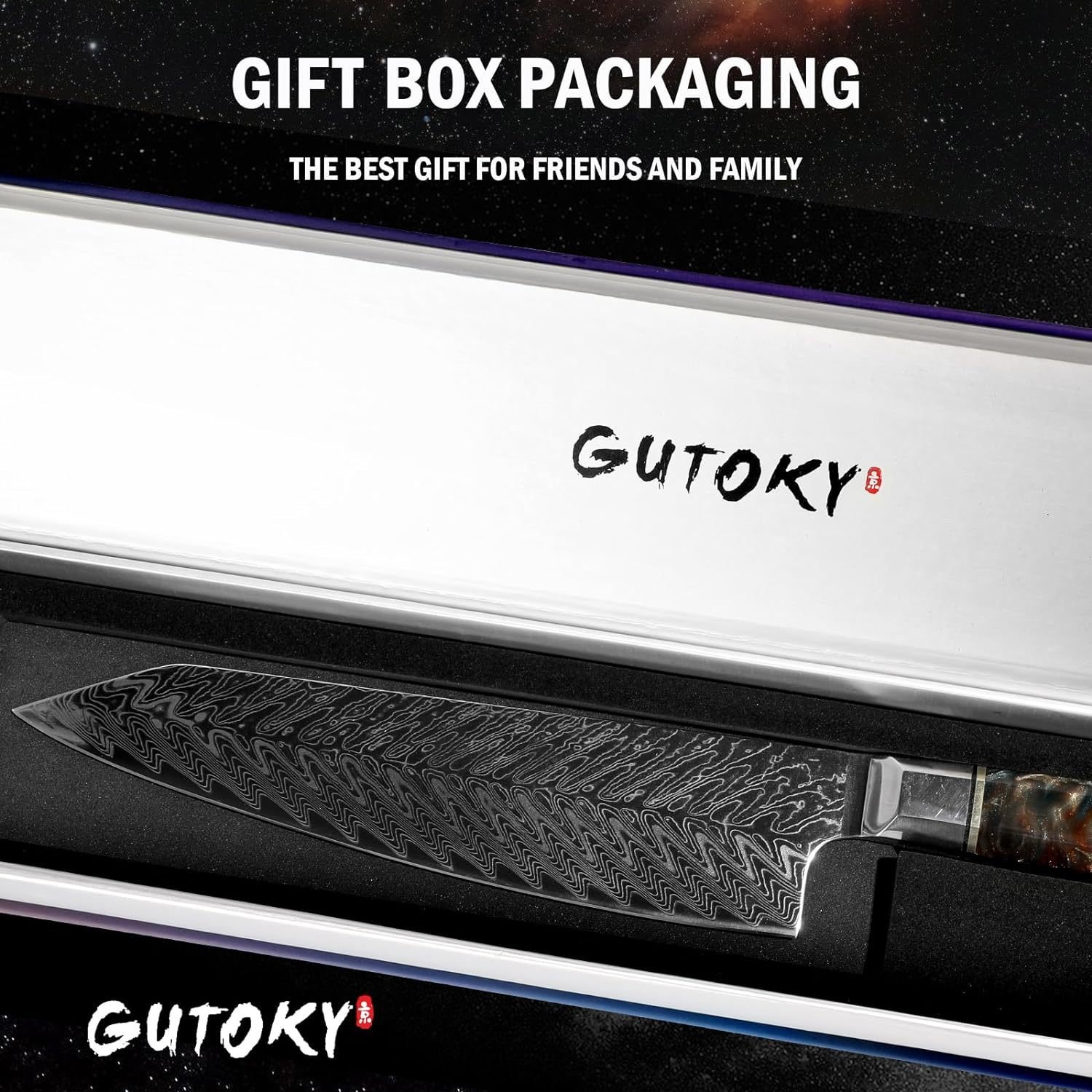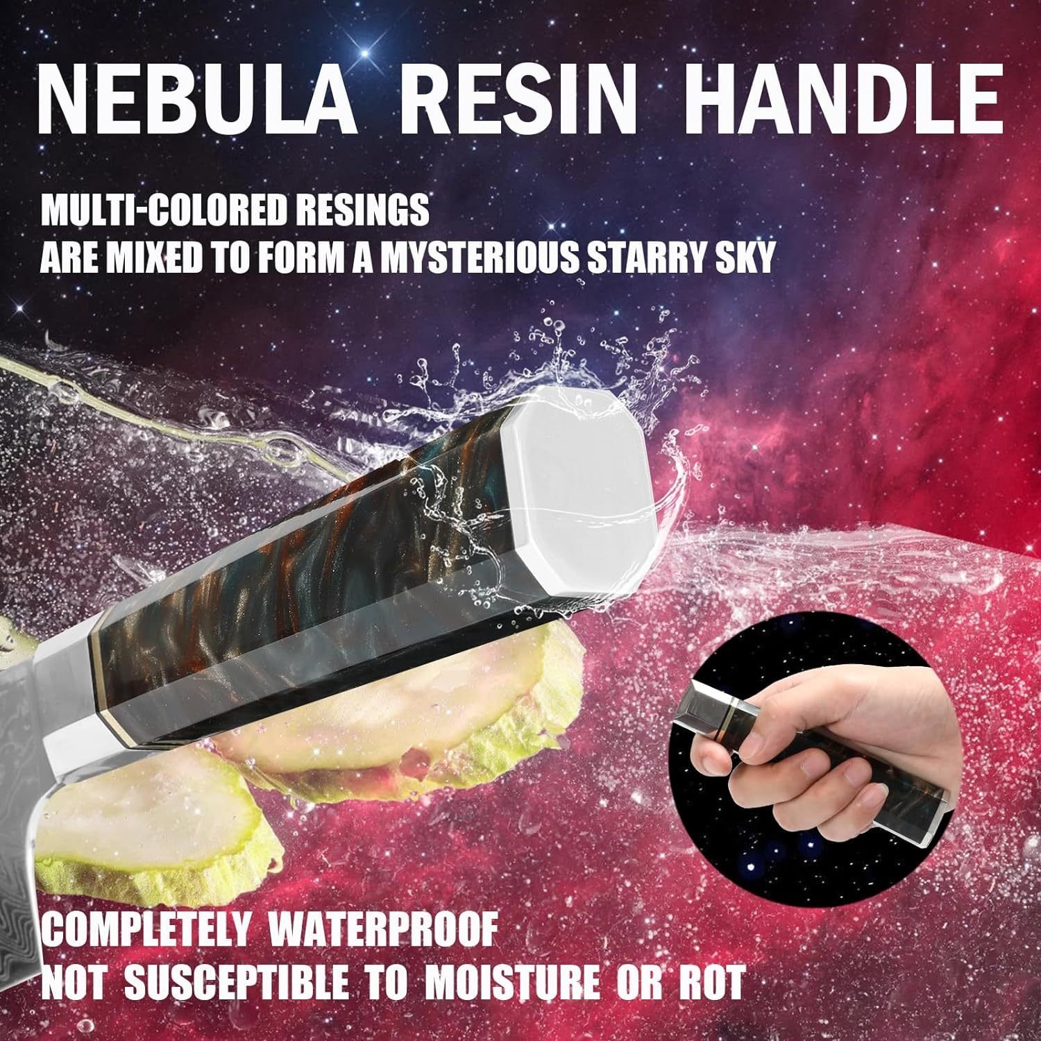 • Hold the Nebula in Your Hands : We refined the nebula into resin and infused it into the handle of this kiritsuke knife to make it looks gleaming. The universe is ever-changing, and you may get any piece of starry sky among them, but every piece of starry sky is full of mystery