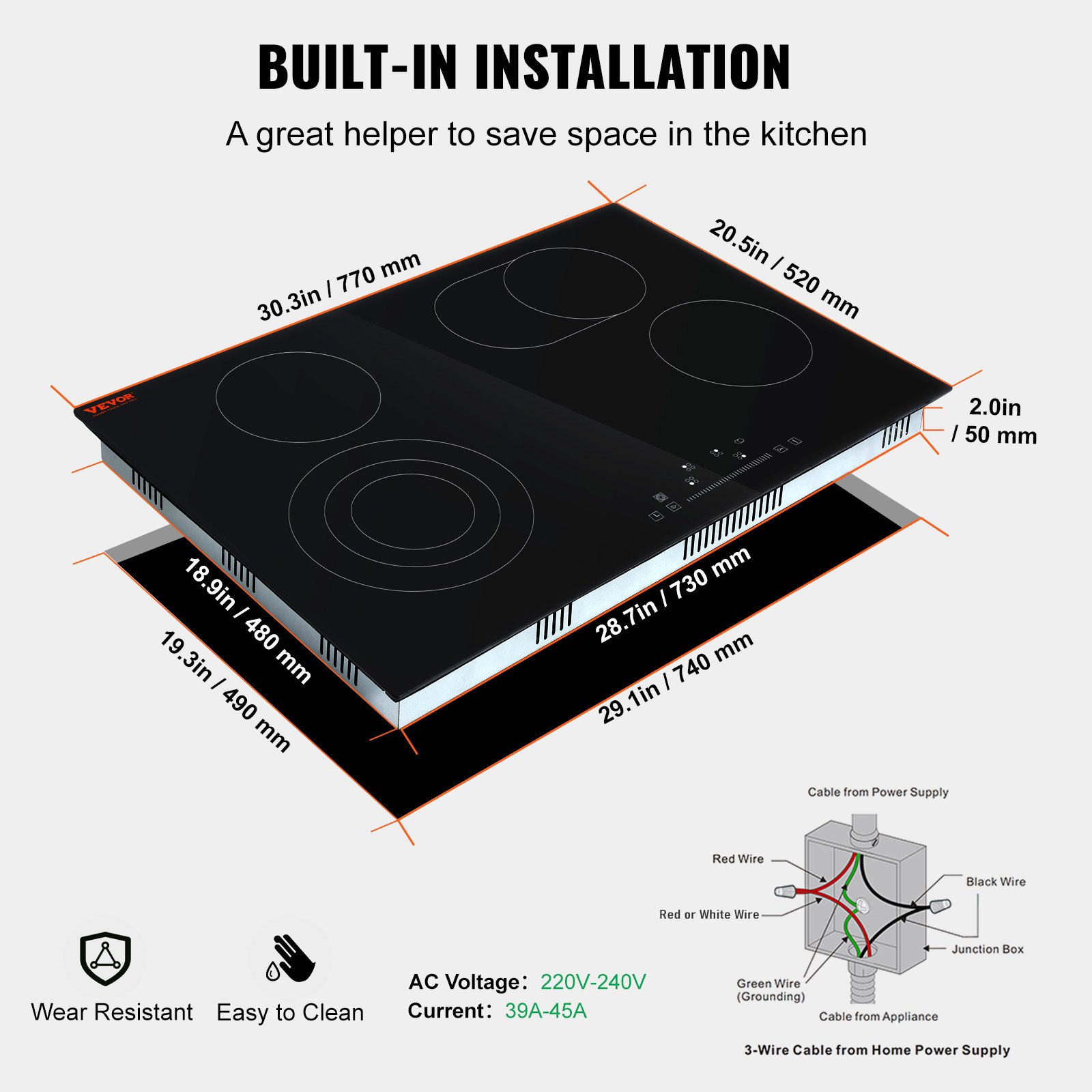 Built In Electric Stove Top, 30.3 X 20.5 Inch 4 Burners, 240V Glass Radiant Cooktop With Sensor Touch Control, Timer & Child Lock Included, 9 Power Levels For Simmer Steam Slow Cook Fry
