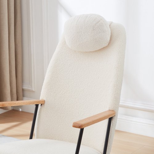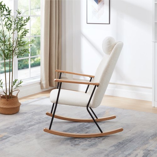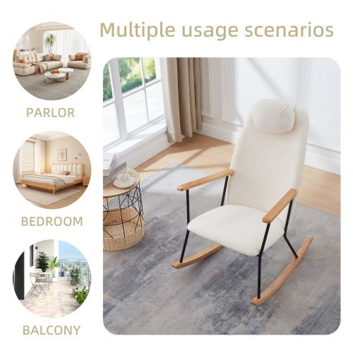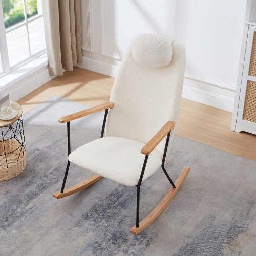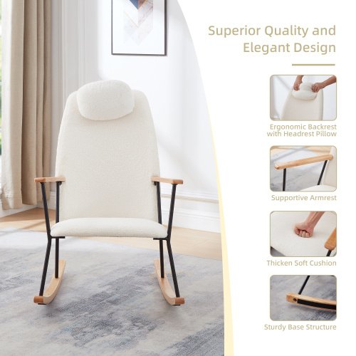 Adjustable headrest rocking chair, teddy fabric upholstered gliding rocking chair, high backrest, modern rocking chair, comfortable side chair for children’s room, bedroom, living room, comfort (white)