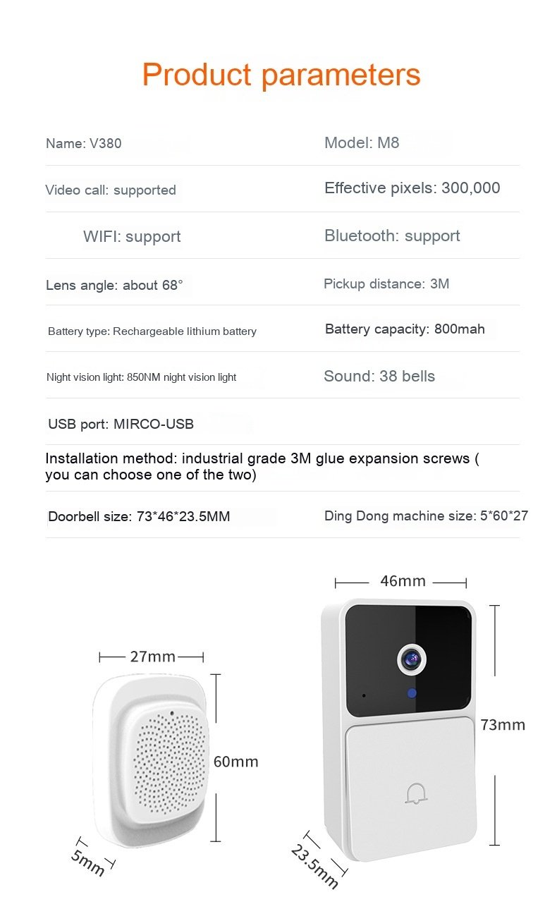 Door bell x1pc+Dingdong machine x1pc+Backglue x1pc+Power cord x1pc+Instruction manual x1pc+Screw pack x1pc